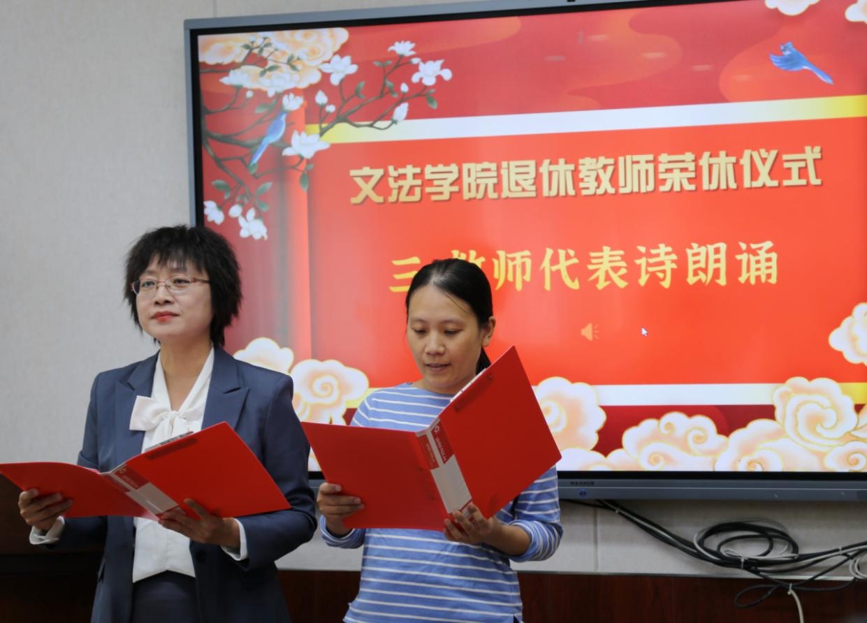 李虹代表学院向光荣退休的徐家力老师致以诚挚感谢和崇高敬意,向新加入文法大家庭的教师表示热烈欢迎。